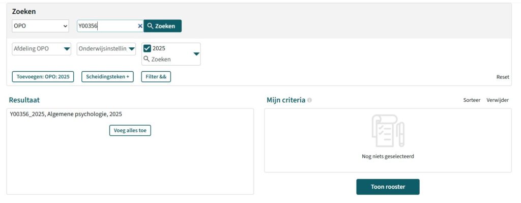 Bij Zoeken selecteer je ‘OPO‘ en typ je de Y-code in het tekstvak (zie screenshots hieronder). Vervolgens klik je op het vergrootglasje. Bij Resultaat klik je dan het opleidingsonderdeel aan waarin je geïnteresseerd bent (selecteer academiejaar 2025!). Je kan dezelfde werkwijze gebruiken voor meerdere opleidingsonderdelen. Heb je alle opleidingsonderdelen opgezocht waarin je geïnteresseerd bent, dan klik je op ‘Toon rooster‘.
